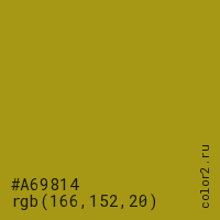 Цвет #A69814 в цветовой модели RGB обозначается тремя октетами (166, 152, 20) в десятичном формате и #A69814 в шестнадцатиричном (hex) формате, которые являются интенсивностью красного 166 (hex A6), интенсивность зелёного 152 (hex 98) и интенсивность синего 20 (hex 14).