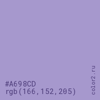 Цвет #A698CD в цветовой модели RGB обозначается тремя октетами (166, 152, 205) в десятичном формате и #A698CD в шестнадцатиричном (hex) формате, которые являются интенсивностью красного 166 (hex A6), интенсивность зелёного 152 (hex 98) и интенсивность синего 205 (hex CD).