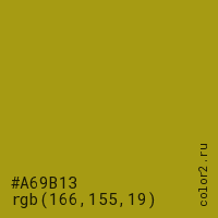 Цвет #A69B13 в цветовой модели RGB обозначается тремя октетами (166, 155, 19) в десятичном формате и #A69B13 в шестнадцатиричном (hex) формате, которые являются интенсивностью красного 166 (hex A6), интенсивность зелёного 155 (hex 9B) и интенсивность синего 19 (hex 13).