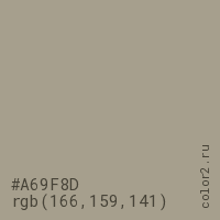 Цвет #A69F8D в цветовой модели RGB обозначается тремя октетами (166, 159, 141) в десятичном формате и #A69F8D в шестнадцатиричном (hex) формате, которые являются интенсивностью красного 166 (hex A6), интенсивность зелёного 159 (hex 9F) и интенсивность синего 141 (hex 8D).