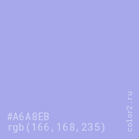 Цвет #A6A8EB в цветовой модели RGB обозначается тремя октетами (166, 168, 235) в десятичном формате и #A6A8EB в шестнадцатиричном (hex) формате, которые являются интенсивностью красного 166 (hex A6), интенсивность зелёного 168 (hex A8) и интенсивность синего 235 (hex EB).