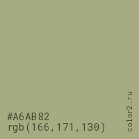 Цвет #A6AB82 в цветовой модели RGB обозначается тремя октетами (166, 171, 130) в десятичном формате и #A6AB82 в шестнадцатиричном (hex) формате, которые являются интенсивностью красного 166 (hex A6), интенсивность зелёного 171 (hex AB) и интенсивность синего 130 (hex 82).