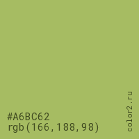 Цвет #A6BC62 в цветовой модели RGB обозначается тремя октетами (166, 188, 98) в десятичном формате и #A6BC62 в шестнадцатиричном (hex) формате, которые являются интенсивностью красного 166 (hex A6), интенсивность зелёного 188 (hex BC) и интенсивность синего 98 (hex 62).