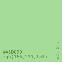 Цвет #A6DC99 в цветовой модели RGB обозначается тремя октетами (166, 220, 153) в десятичном формате и #A6DC99 в шестнадцатиричном (hex) формате, которые являются интенсивностью красного 166 (hex A6), интенсивность зелёного 220 (hex DC) и интенсивность синего 153 (hex 99).