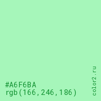 Цвет #A6F6BA в цветовой модели RGB обозначается тремя октетами (166, 246, 186) в десятичном формате и #A6F6BA в шестнадцатиричном (hex) формате, которые являются интенсивностью красного 166 (hex A6), интенсивность зелёного 246 (hex F6) и интенсивность синего 186 (hex BA).