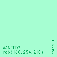 Цвет #A6FED2 в цветовой модели RGB обозначается тремя октетами (166, 254, 210) в десятичном формате и #A6FED2 в шестнадцатиричном (hex) формате, которые являются интенсивностью красного 166 (hex A6), интенсивность зелёного 254 (hex FE) и интенсивность синего 210 (hex D2).