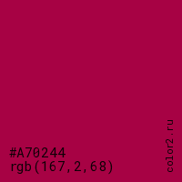 Цвет #A70244 в цветовой модели RGB обозначается тремя октетами (167, 2, 68) в десятичном формате и #A70244 в шестнадцатиричном (hex) формате, которые являются интенсивностью красного 167 (hex A7), интенсивность зелёного 2 (hex 02) и интенсивность синего 68 (hex 44).
