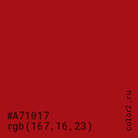 Цвет #A71017 в цветовой модели RGB обозначается тремя октетами (167, 16, 23) в десятичном формате и #A71017 в шестнадцатиричном (hex) формате, которые являются интенсивностью красного 167 (hex A7), интенсивность зелёного 16 (hex 10) и интенсивность синего 23 (hex 17).