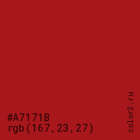 Цвет #A7171B в цветовой модели RGB обозначается тремя октетами (167, 23, 27) в десятичном формате и #A7171B в шестнадцатиричном (hex) формате, которые являются интенсивностью красного 167 (hex A7), интенсивность зелёного 23 (hex 17) и интенсивность синего 27 (hex 1B).