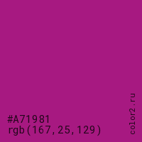 Цвет #A71981 в цветовой модели RGB обозначается тремя октетами (167, 25, 129) в десятичном формате и #A71981 в шестнадцатиричном (hex) формате, которые являются интенсивностью красного 167 (hex A7), интенсивность зелёного 25 (hex 19) и интенсивность синего 129 (hex 81).