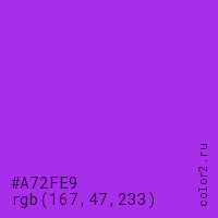 Цвет #A72FE9 в цветовой модели RGB обозначается тремя октетами (167, 47, 233) в десятичном формате и #A72FE9 в шестнадцатиричном (hex) формате, которые являются интенсивностью красного 167 (hex A7), интенсивность зелёного 47 (hex 2F) и интенсивность синего 233 (hex E9).