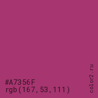 Цвет #A7356F в цветовой модели RGB обозначается тремя октетами (167, 53, 111) в десятичном формате и #A7356F в шестнадцатиричном (hex) формате, которые являются интенсивностью красного 167 (hex A7), интенсивность зелёного 53 (hex 35) и интенсивность синего 111 (hex 6F).
