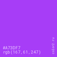 Цвет #A73DF7 в цветовой модели RGB обозначается тремя октетами (167, 61, 247) в десятичном формате и #A73DF7 в шестнадцатиричном (hex) формате, которые являются интенсивностью красного 167 (hex A7), интенсивность зелёного 61 (hex 3D) и интенсивность синего 247 (hex F7).