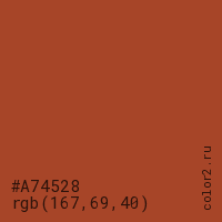 Цвет #A74528 в цветовой модели RGB обозначается тремя октетами (167, 69, 40) в десятичном формате и #A74528 в шестнадцатиричном (hex) формате, которые являются интенсивностью красного 167 (hex A7), интенсивность зелёного 69 (hex 45) и интенсивность синего 40 (hex 28).