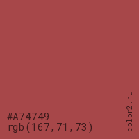 Цвет #A74749 в цветовой модели RGB обозначается тремя октетами (167, 71, 73) в десятичном формате и #A74749 в шестнадцатиричном (hex) формате, которые являются интенсивностью красного 167 (hex A7), интенсивность зелёного 71 (hex 47) и интенсивность синего 73 (hex 49).