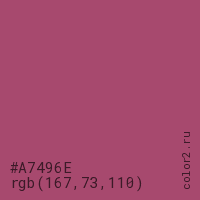 Цвет #A7496E в цветовой модели RGB обозначается тремя октетами (167, 73, 110) в десятичном формате и #A7496E в шестнадцатиричном (hex) формате, которые являются интенсивностью красного 167 (hex A7), интенсивность зелёного 73 (hex 49) и интенсивность синего 110 (hex 6E).