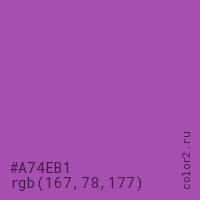 Цвет #A74EB1 в цветовой модели RGB обозначается тремя октетами (167, 78, 177) в десятичном формате и #A74EB1 в шестнадцатиричном (hex) формате, которые являются интенсивностью красного 167 (hex A7), интенсивность зелёного 78 (hex 4E) и интенсивность синего 177 (hex B1).