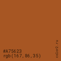 Цвет #A75623 в цветовой модели RGB обозначается тремя октетами (167, 86, 35) в десятичном формате и #A75623 в шестнадцатиричном (hex) формате, которые являются интенсивностью красного 167 (hex A7), интенсивность зелёного 86 (hex 56) и интенсивность синего 35 (hex 23).