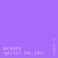 Цвет #A76AF9 в цветовой модели RGB обозначается тремя октетами (167, 106, 249) в десятичном формате и #A76AF9 в шестнадцатиричном (hex) формате, которые являются интенсивностью красного 167 (hex A7), интенсивность зелёного 106 (hex 6A) и интенсивность синего 249 (hex F9).