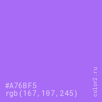 Цвет #A76BF5 в цветовой модели RGB обозначается тремя октетами (167, 107, 245) в десятичном формате и #A76BF5 в шестнадцатиричном (hex) формате, которые являются интенсивностью красного 167 (hex A7), интенсивность зелёного 107 (hex 6B) и интенсивность синего 245 (hex F5).