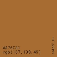 Цвет #A76C31 в цветовой модели RGB обозначается тремя октетами (167, 108, 49) в десятичном формате и #A76C31 в шестнадцатиричном (hex) формате, которые являются интенсивностью красного 167 (hex A7), интенсивность зелёного 108 (hex 6C) и интенсивность синего 49 (hex 31).