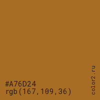 Цвет #A76D24 в цветовой модели RGB обозначается тремя октетами (167, 109, 36) в десятичном формате и #A76D24 в шестнадцатиричном (hex) формате, которые являются интенсивностью красного 167 (hex A7), интенсивность зелёного 109 (hex 6D) и интенсивность синего 36 (hex 24).