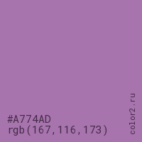 Цвет #A774AD в цветовой модели RGB обозначается тремя октетами (167, 116, 173) в десятичном формате и #A774AD в шестнадцатиричном (hex) формате, которые являются интенсивностью красного 167 (hex A7), интенсивность зелёного 116 (hex 74) и интенсивность синего 173 (hex AD).