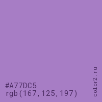 Цвет #A77DC5 в цветовой модели RGB обозначается тремя октетами (167, 125, 197) в десятичном формате и #A77DC5 в шестнадцатиричном (hex) формате, которые являются интенсивностью красного 167 (hex A7), интенсивность зелёного 125 (hex 7D) и интенсивность синего 197 (hex C5).