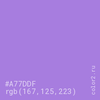 Цвет #A77DDF в цветовой модели RGB обозначается тремя октетами (167, 125, 223) в десятичном формате и #A77DDF в шестнадцатиричном (hex) формате, которые являются интенсивностью красного 167 (hex A7), интенсивность зелёного 125 (hex 7D) и интенсивность синего 223 (hex DF).