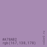 Цвет #A78AB2 в цветовой модели RGB обозначается тремя октетами (167, 138, 178) в десятичном формате и #A78AB2 в шестнадцатиричном (hex) формате, которые являются интенсивностью красного 167 (hex A7), интенсивность зелёного 138 (hex 8A) и интенсивность синего 178 (hex B2).