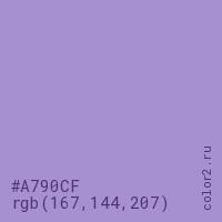 Цвет #A790CF в цветовой модели RGB обозначается тремя октетами (167, 144, 207) в десятичном формате и #A790CF в шестнадцатиричном (hex) формате, которые являются интенсивностью красного 167 (hex A7), интенсивность зелёного 144 (hex 90) и интенсивность синего 207 (hex CF).