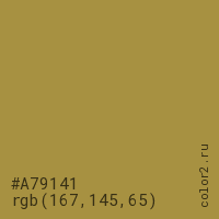 Цвет #A79141 в цветовой модели RGB обозначается тремя октетами (167, 145, 65) в десятичном формате и #A79141 в шестнадцатиричном (hex) формате, которые являются интенсивностью красного 167 (hex A7), интенсивность зелёного 145 (hex 91) и интенсивность синего 65 (hex 41).