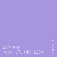 Цвет #A795DF в цветовой модели RGB обозначается тремя октетами (167, 149, 223) в десятичном формате и #A795DF в шестнадцатиричном (hex) формате, которые являются интенсивностью красного 167 (hex A7), интенсивность зелёного 149 (hex 95) и интенсивность синего 223 (hex DF).