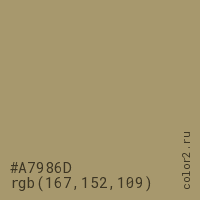 Цвет #A7986D в цветовой модели RGB обозначается тремя октетами (167, 152, 109) в десятичном формате и #A7986D в шестнадцатиричном (hex) формате, которые являются интенсивностью красного 167 (hex A7), интенсивность зелёного 152 (hex 98) и интенсивность синего 109 (hex 6D).