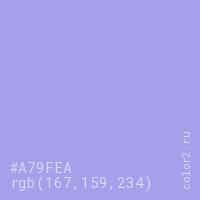 Цвет RGB(167, 159, 234) в процентом отношении количества цвета состоит из 65.5% красного (red), 62.4% зелёного (green) и 91.8% синего (blue).