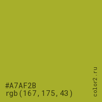 Цвет #A7AF2B в цветовой модели RGB обозначается тремя октетами (167, 175, 43) в десятичном формате и #A7AF2B в шестнадцатиричном (hex) формате, которые являются интенсивностью красного 167 (hex A7), интенсивность зелёного 175 (hex AF) и интенсивность синего 43 (hex 2B).