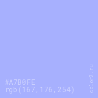 Цвет #A7B0FE в цветовой модели RGB обозначается тремя октетами (167, 176, 254) в десятичном формате и #A7B0FE в шестнадцатиричном (hex) формате, которые являются интенсивностью красного 167 (hex A7), интенсивность зелёного 176 (hex B0) и интенсивность синего 254 (hex FE).