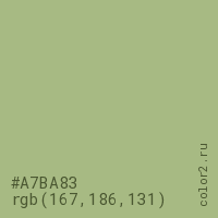 Цвет #A7BA83 в цветовой модели RGB обозначается тремя октетами (167, 186, 131) в десятичном формате и #A7BA83 в шестнадцатиричном (hex) формате, которые являются интенсивностью красного 167 (hex A7), интенсивность зелёного 186 (hex BA) и интенсивность синего 131 (hex 83).