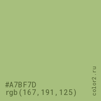 Цвет #A7BF7D в цветовой модели RGB обозначается тремя октетами (167, 191, 125) в десятичном формате и #A7BF7D в шестнадцатиричном (hex) формате, которые являются интенсивностью красного 167 (hex A7), интенсивность зелёного 191 (hex BF) и интенсивность синего 125 (hex 7D).
