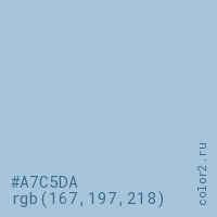 Цвет #A7C5DA в цветовой модели RGB обозначается тремя октетами (167, 197, 218) в десятичном формате и #A7C5DA в шестнадцатиричном (hex) формате, которые являются интенсивностью красного 167 (hex A7), интенсивность зелёного 197 (hex C5) и интенсивность синего 218 (hex DA).