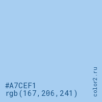 Цвет #A7CEF1 в цветовой модели RGB обозначается тремя октетами (167, 206, 241) в десятичном формате и #A7CEF1 в шестнадцатиричном (hex) формате, которые являются интенсивностью красного 167 (hex A7), интенсивность зелёного 206 (hex CE) и интенсивность синего 241 (hex F1).