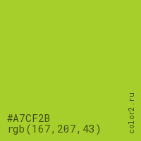Цвет #A7CF2B в цветовой модели RGB обозначается тремя октетами (167, 207, 43) в десятичном формате и #A7CF2B в шестнадцатиричном (hex) формате, которые являются интенсивностью красного 167 (hex A7), интенсивность зелёного 207 (hex CF) и интенсивность синего 43 (hex 2B).