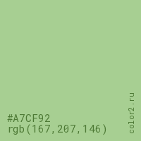 Цвет #A7CF92 в цветовой модели RGB обозначается тремя октетами (167, 207, 146) в десятичном формате и #A7CF92 в шестнадцатиричном (hex) формате, которые являются интенсивностью красного 167 (hex A7), интенсивность зелёного 207 (hex CF) и интенсивность синего 146 (hex 92).