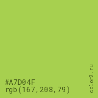 Цвет #A7D04F в цветовой модели RGB обозначается тремя октетами (167, 208, 79) в десятичном формате и #A7D04F в шестнадцатиричном (hex) формате, которые являются интенсивностью красного 167 (hex A7), интенсивность зелёного 208 (hex D0) и интенсивность синего 79 (hex 4F).