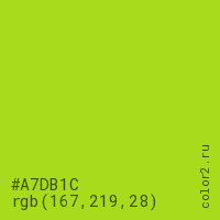 Цвет #A7DB1C в цветовой модели RGB обозначается тремя октетами (167, 219, 28) в десятичном формате и #A7DB1C в шестнадцатиричном (hex) формате, которые являются интенсивностью красного 167 (hex A7), интенсивность зелёного 219 (hex DB) и интенсивность синего 28 (hex 1C).