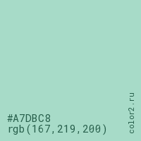Цвет #A7DBC8 в цветовой модели RGB обозначается тремя октетами (167, 219, 200) в десятичном формате и #A7DBC8 в шестнадцатиричном (hex) формате, которые являются интенсивностью красного 167 (hex A7), интенсивность зелёного 219 (hex DB) и интенсивность синего 200 (hex C8).