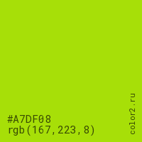 Цвет #A7DF08 в цветовой модели RGB обозначается тремя октетами (167, 223, 8) в десятичном формате и #A7DF08 в шестнадцатиричном (hex) формате, которые являются интенсивностью красного 167 (hex A7), интенсивность зелёного 223 (hex DF) и интенсивность синего 8 (hex 08).