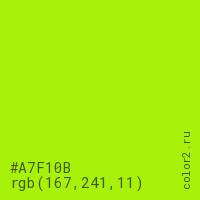 Цвет #A7F10B в цветовой модели RGB обозначается тремя октетами (167, 241, 11) в десятичном формате и #A7F10B в шестнадцатиричном (hex) формате, которые являются интенсивностью красного 167 (hex A7), интенсивность зелёного 241 (hex F1) и интенсивность синего 11 (hex 0B).