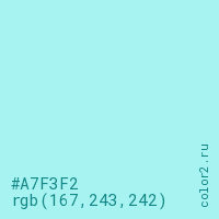 Цвет #A7F3F2 в цветовой модели RGB обозначается тремя октетами (167, 243, 242) в десятичном формате и #A7F3F2 в шестнадцатиричном (hex) формате, которые являются интенсивностью красного 167 (hex A7), интенсивность зелёного 243 (hex F3) и интенсивность синего 242 (hex F2).