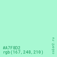 Цвет #A7F8D2 в цветовой модели RGB обозначается тремя октетами (167, 248, 210) в десятичном формате и #A7F8D2 в шестнадцатиричном (hex) формате, которые являются интенсивностью красного 167 (hex A7), интенсивность зелёного 248 (hex F8) и интенсивность синего 210 (hex D2).